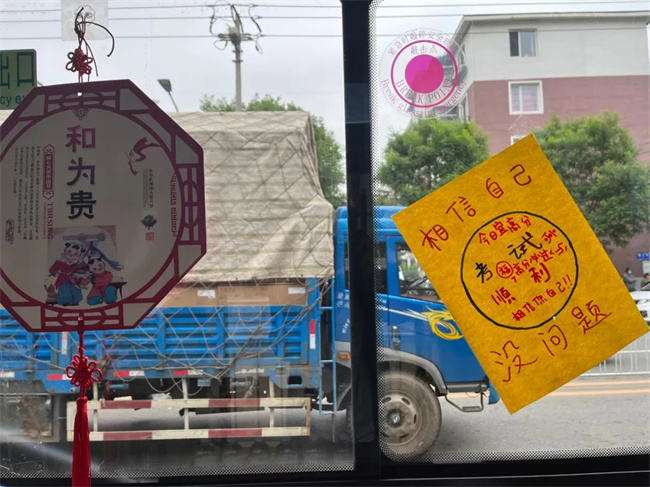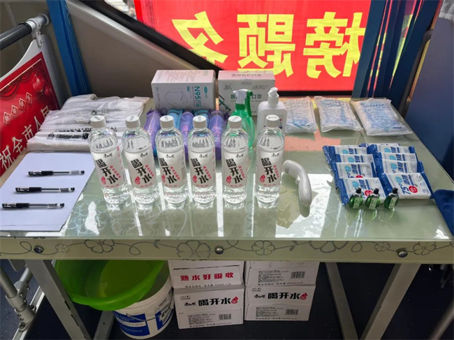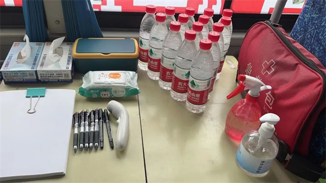 車內(nèi)雨傘、礦泉水、消毒液、消毒濕巾、口罩等一應(yīng)俱全,車身上還懸掛有“高考愛心服務(wù)車 217路為您服務(wù)”等字樣的條幅,這是張玲為了參與愛心助力高考活動,提前精心布置的車輛。