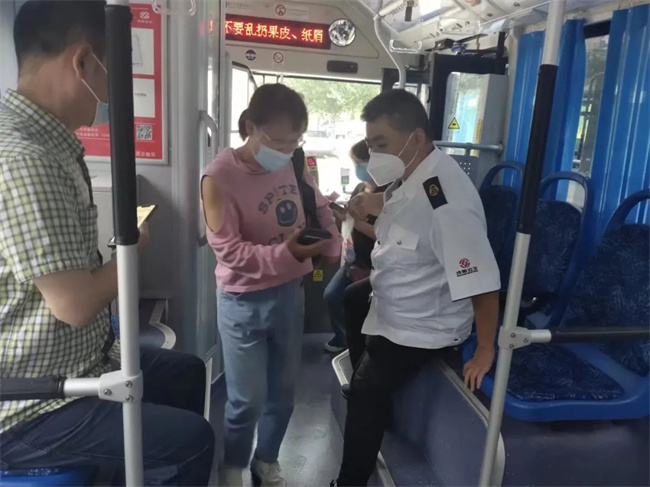在長客西站264路、103路始發(fā)站,副隊(duì)長程玉磊配合公交駕駛員對乘客的健康碼、72小時(shí)核酸陰性證明、規(guī)范佩戴口罩、測量體溫等工作進(jìn)行檢查,廣大乘客主動(dòng)配合。