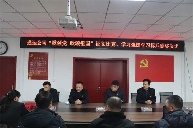 1月12日上午,通運(yùn)公司在一樓會(huì)議室召開(kāi)“歌頌黨 歌頌祖國(guó)”征文比賽、學(xué)習(xí)強(qiáng)國(guó)學(xué)習(xí)標(biāo)兵頒獎(jiǎng)儀式,公司領(lǐng)導(dǎo)班子及各支部書記、獲獎(jiǎng)職工代表參加,共30余人。