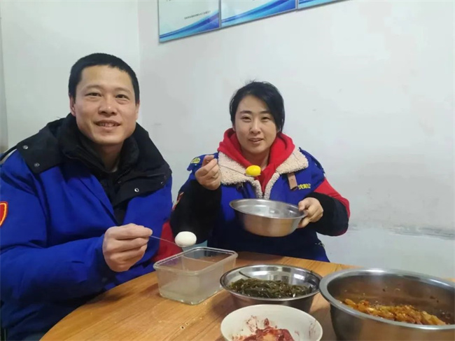 車隊為堅守崗位的駕駛員煮了元宵、餃子,同時送上節(jié)日祝福?!白D憬衲晔杖朐黾印薄ⅰ白D憬衲晟眢w健康”,“祝你今年大展宏圖”......在聲聲祝福中,駕駛員們開開心心吃著元宵、餃子。大家甜在嘴里,暖在心里,臉上露出幸福的笑容。