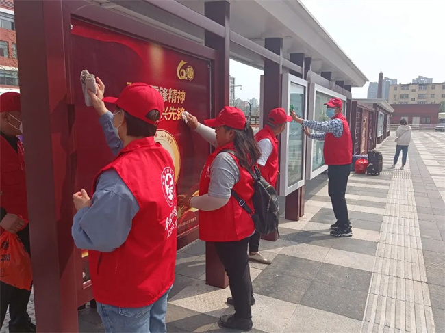 活動中,志愿者們身穿紅馬甲、頭戴小紅帽,手中拿著抹布、清潔刷、水桶等清潔工具,對樞紐站內(nèi)的候車廊、站臺等進行集中大清掃。