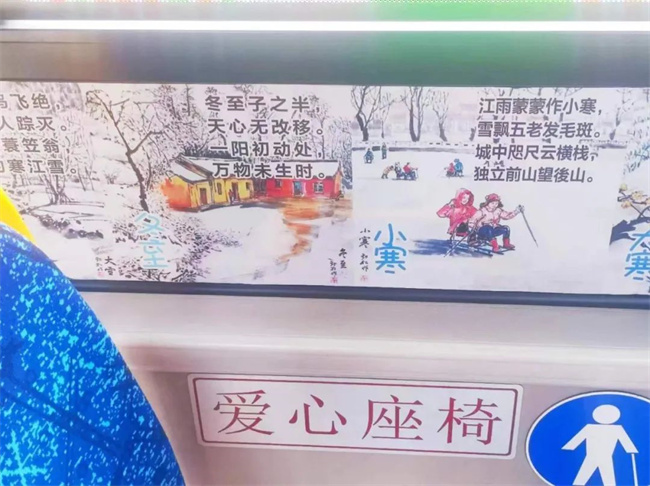 據(jù)方堃介紹,除了給乘客提供座墊套的服務(wù)外,她還通過上網(wǎng)搜集24節(jié)氣常識和詩句,在車廂內(nèi)的座位附近張貼了24節(jié)氣的相關(guān)詩句,方便乘客了解民風(fēng)民俗,弘揚(yáng)傳統(tǒng)文化,這些常識類的詩句很受一些帶孩子乘車的家長和孩子們的歡迎。