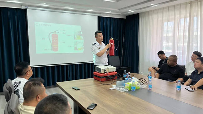 會議室內(nèi),黃教官通過課件和實操相結(jié)合的形式,用一件件真實發(fā)生的案例向大家講解了各類火災(zāi)的特點與應(yīng)對方法,以及遇到汛情及臺風(fēng)時的處理辦法等,并通過“提、拔、握、壓”四字口訣教會大家如何正確使用滅火器。