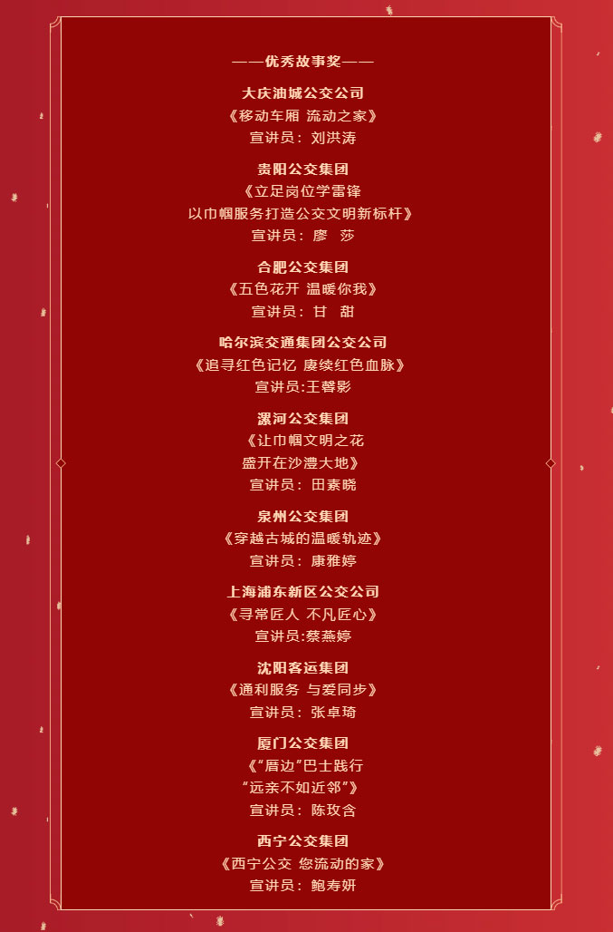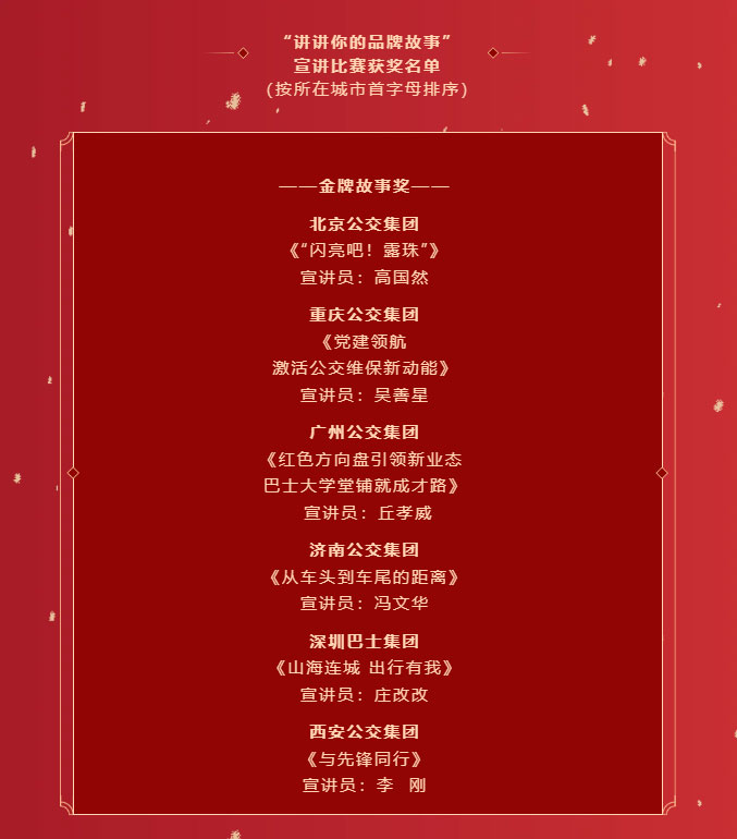 經(jīng)過專業(yè)老師、現(xiàn)場評委評審打分,城市公交政研會審核決定:深圳、北京、廣州等6地公交企業(yè)宣講作品榮獲金牌故事獎;武漢、宜昌、石家莊等8地公交企業(yè)宣講作品榮獲銀牌故事獎;合肥、貴陽、沈陽等10地公交企業(yè)宣講作品榮獲優(yōu)秀故事獎。