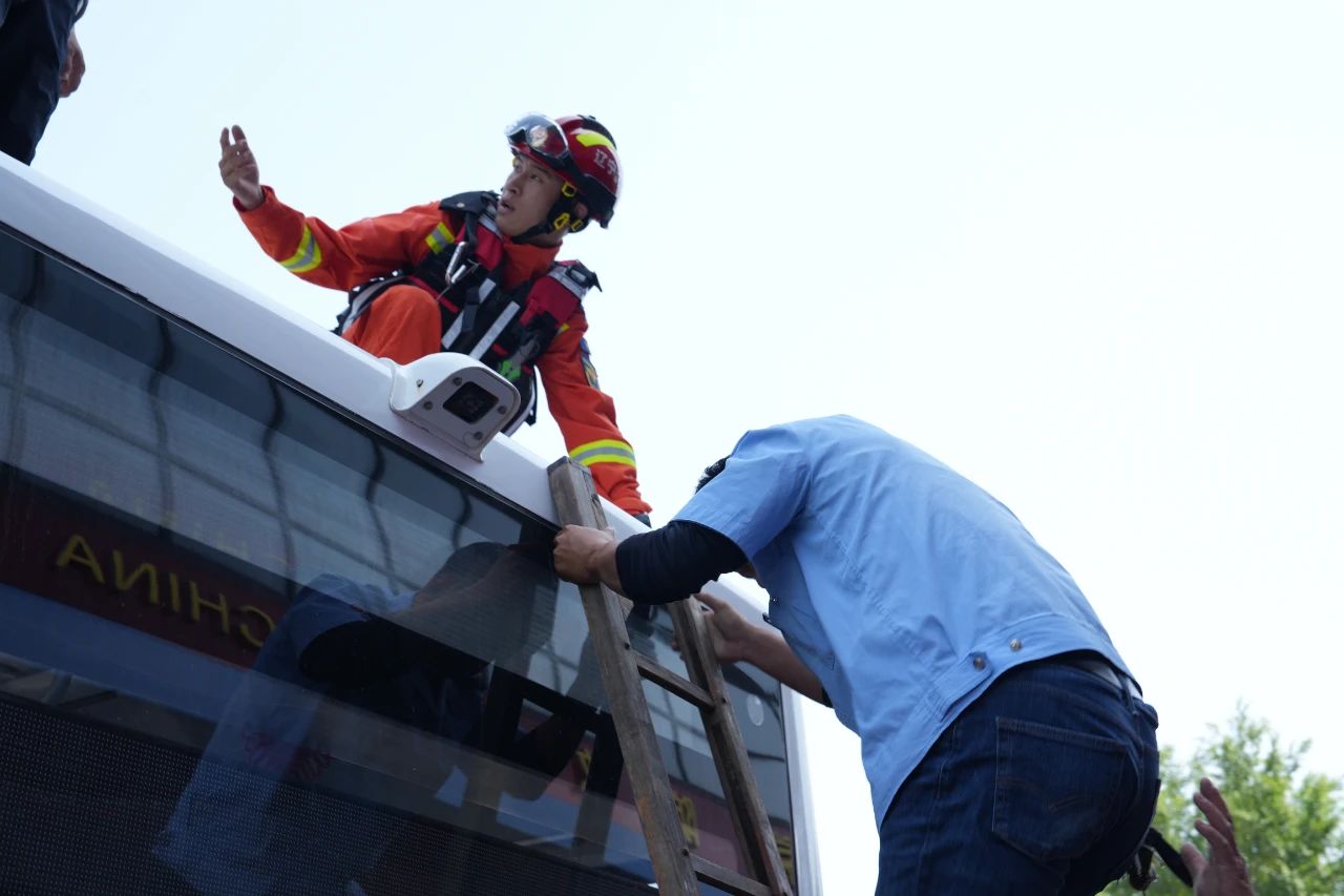緊隨火情處置,演練模擬強(qiáng)降雨導(dǎo)致路段嚴(yán)重積水,一輛公交車被困深水區(qū)。駕駛員迅速組織乘客轉(zhuǎn)移至車廂高位避險,并向公司調(diào)度中心求助。調(diào)度中心通過智能監(jiān)控系統(tǒng)實時鎖定車輛位置,協(xié)調(diào)消防救援力量。救援人員攜帶梯子、水上救生艇等專業(yè)裝備迅速抵達(dá)。采用繩索牽引技術(shù)建立安全通道,有序轉(zhuǎn)移乘客,并對特殊群體實施“一對一”精準(zhǔn)救助,15分鐘內(nèi)完成全部被困人員安全轉(zhuǎn)移。