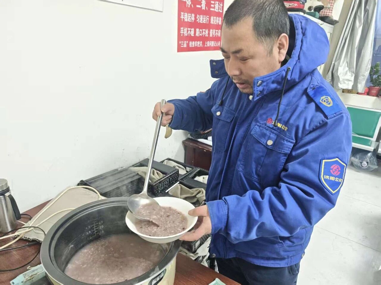臘月初八臘八節(jié),天還未大亮,沈蘇公司128路車隊(duì)已熬好滿滿一鍋臘八粥,將溫?zé)岬男囊馐⑷胪胫?,為即將出發(fā)運(yùn)營(yíng)的一線駕駛員送上一份暖胃更暖心的早餐。