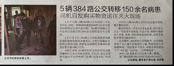 醫(yī)院里有不少肢體障礙的病人、生活不能自理的病人,還有一些精神病患者,從醫(yī)院轉(zhuǎn)移到車里十分吃力。留下的5名駕駛員和下班后聞訊趕到的馮永斌等7名駕駛員毫不猶豫地沖上前,連扶帶抬,連背帶扛,將患者轉(zhuǎn)移到車上。醫(yī)院對面就是火場,駕駛員們不顧自身安危,連水都來不及喝上一口,緊張有序、有條不紊的進行疏散工作。直至晚23時30分,成功將所有醫(yī)患人員輸送至馬耳山分院。
