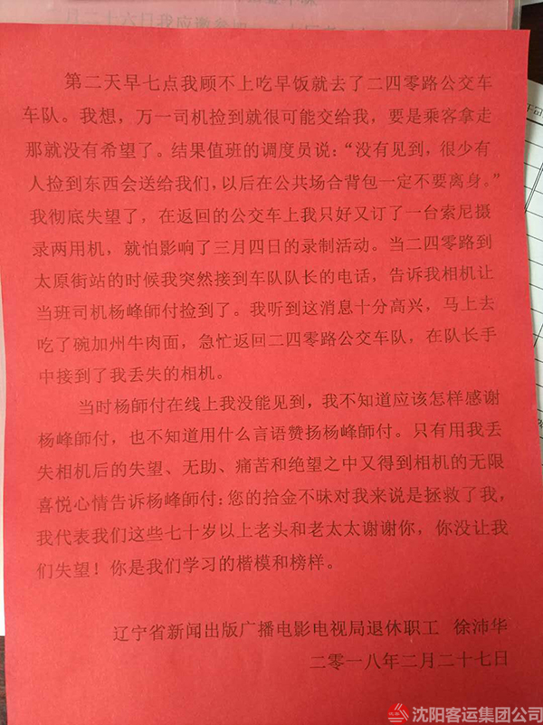 原來,當日下午徐沛華老人剛剛參加完老工友聚會,在乘坐240路公交車回家時將攜帶的攝影包遺落在車上,到家后才發(fā)現(xiàn)自己的攝影包丟失了。老人回想可能是遺落在240路車上了,他抱著試試看的態(tài)度來到240車隊,令他沒想到的是,相機完好無損的在那里等待它主人的到來,失而復得的喜悅讓老人激動不已,老人說,“昨晚我一夜沒有睡好,相機里的照片和視頻對我來說是非常珍貴的,要是丟了我真不知道怎么辦才好,真的非常感謝駕駛員楊峰同志......”隨后,老人親自把“拾金不昧 弘揚正氣”的錦旗送到了楊峰手中,“楊師傅的這種拾金不昧的精神是雷鋒精神的一種傳承,是現(xiàn)在年輕人學習的榜樣”,老人激動的說。在公交車這個不足十平米的車廂里,楊峰用自己的善舉為城市文明傳遞著一份正能量。