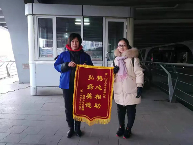 次日,盧女士懷著激動(dòng)的心情,手里捧著錦旗來(lái)到龍之夢(mèng)終點(diǎn)站,親自將錦旗交給了楊紅艷手中并合影留念。